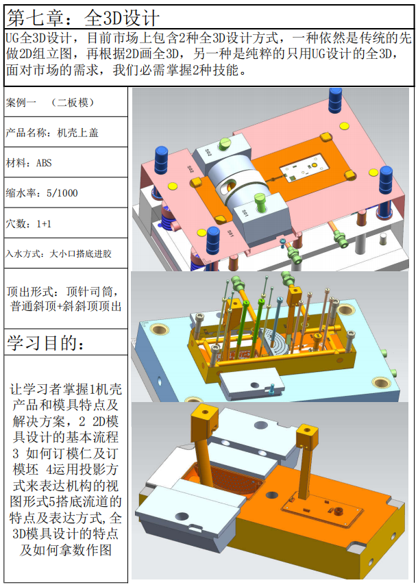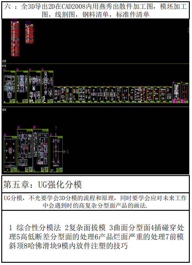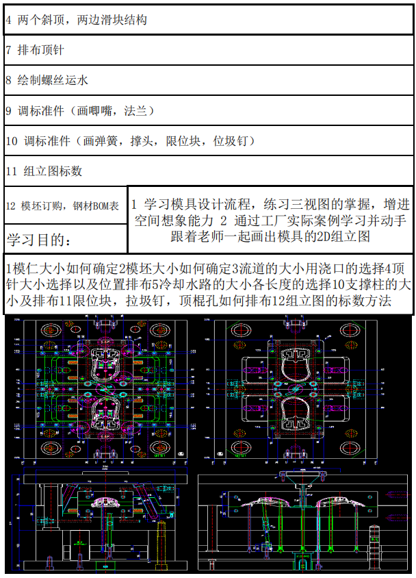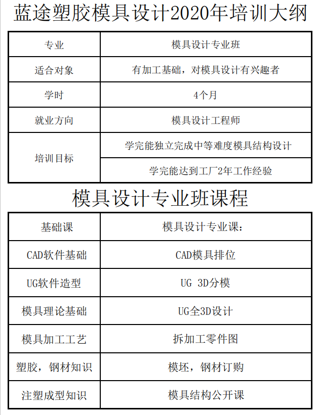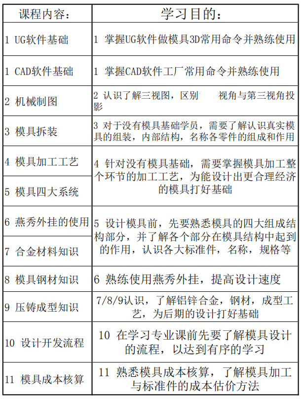 熟悉CAD软件及机械制图;熟悉UG軟件的应用;了解模具设计的流程;学习深入了解模具加工整体工艺与设计外挂的应用;培养能独立完成整套模具设计,符合企业需求,到达工厂2年经验水平为目标。