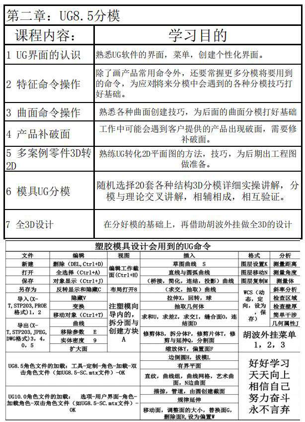 二 建模模块学习目标:学会看三视图,熟练使用画产品常用命令与方法,为后期3D分模打好基础。